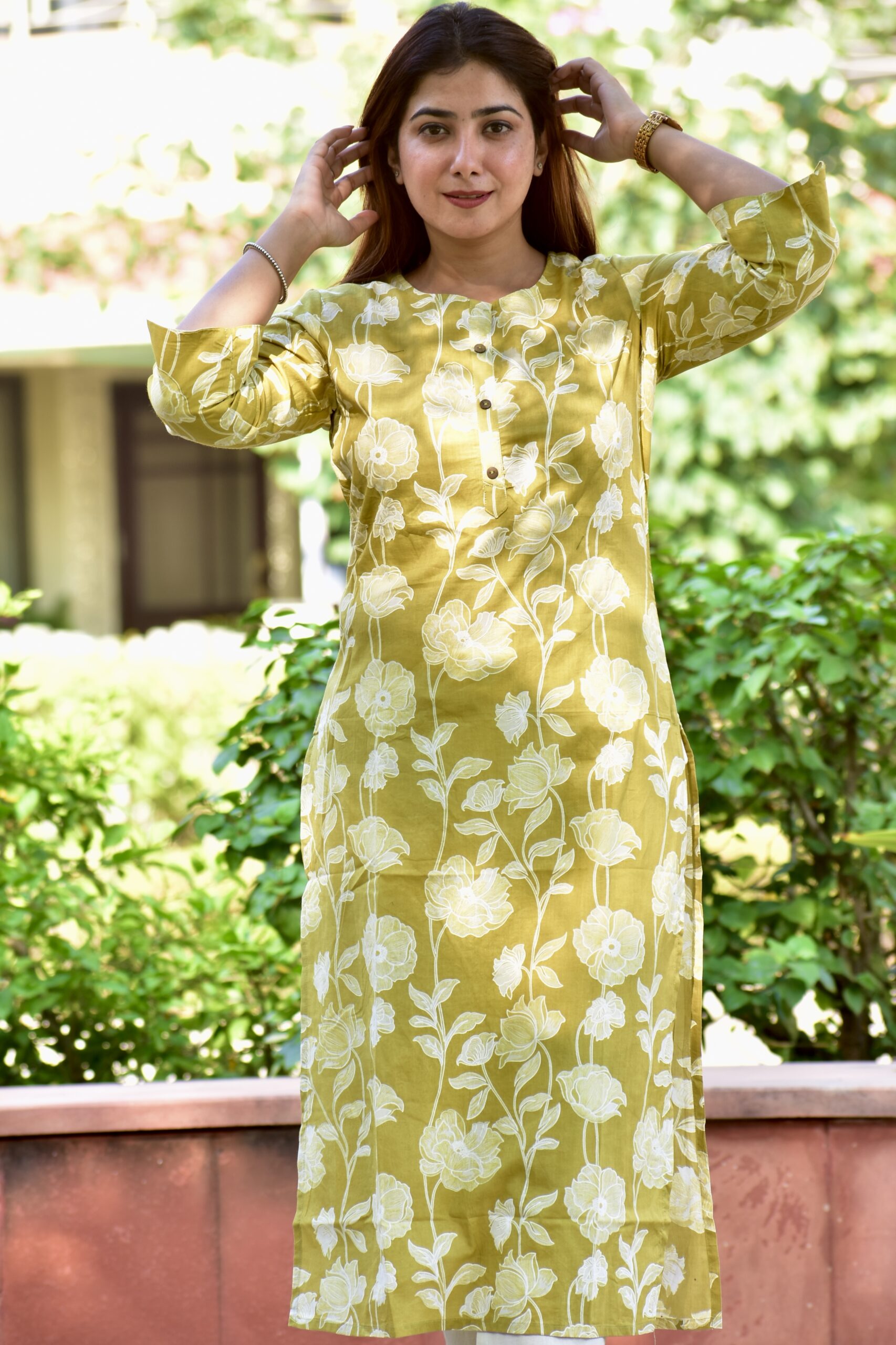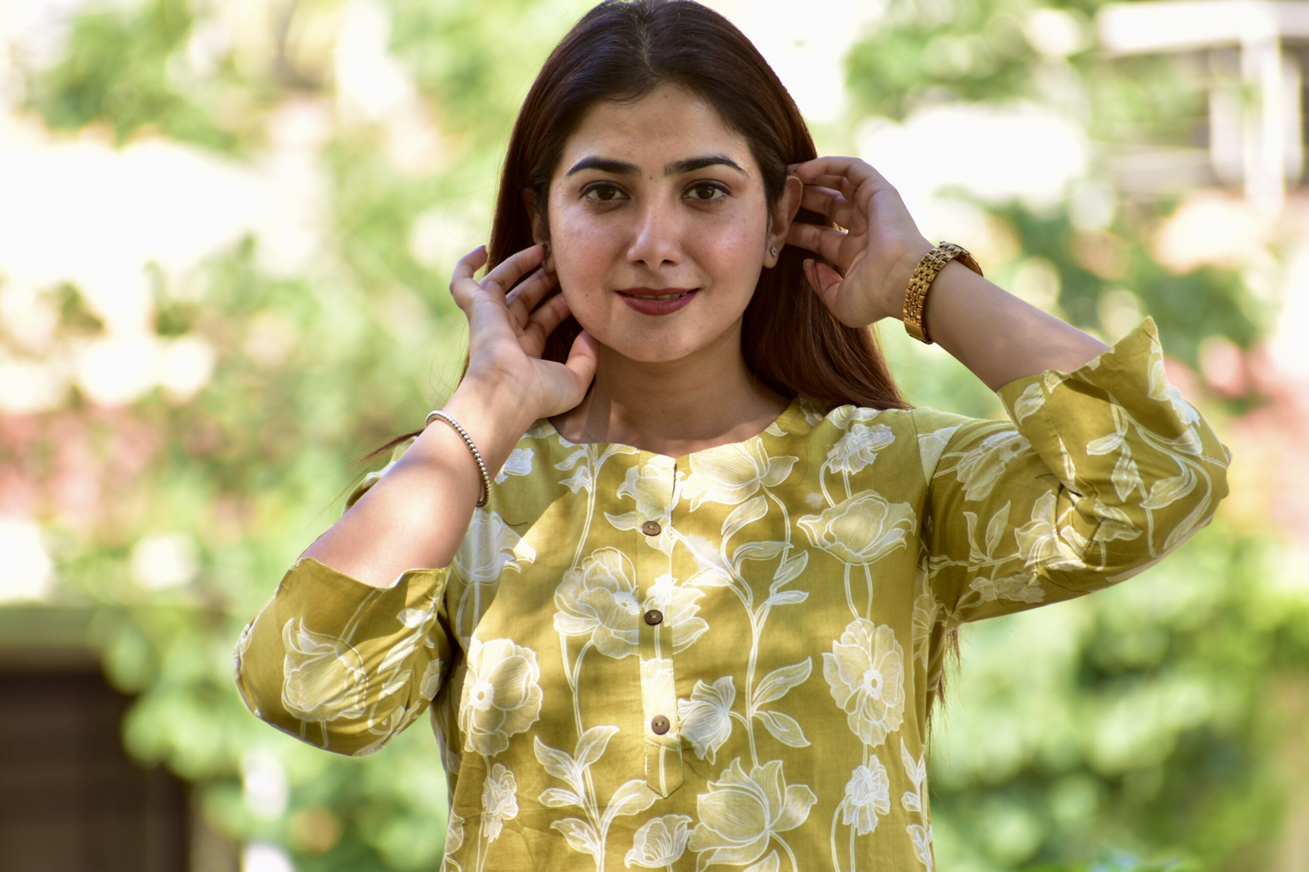 A chic button accessory along the front elevates the overall look, making it perfect for both casual days and semi-formal occasions. Soft, breathable, and designed for everyday ease, this kurti is the one piece your wardrobe will reach for again and again.